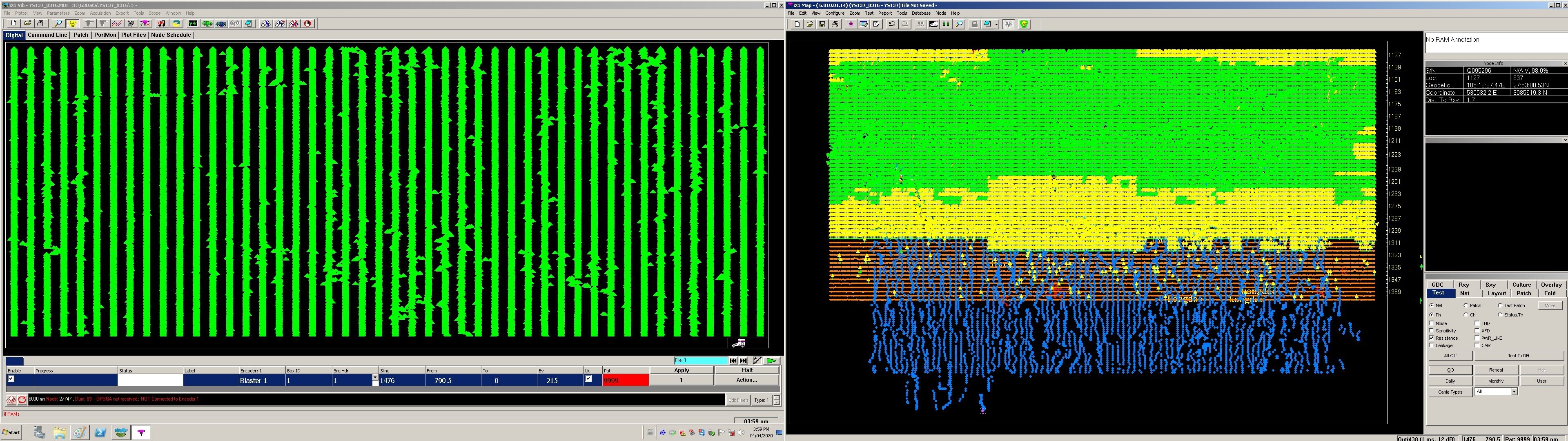 Field QC tools running the iX1 Quantum QC application were used to collect detailed receiver status information in the field. The QC tools were equipped with wireless cellular capability that allowed status information in the field to be sent over the existing cell network to the central iX1 acquisition computer. This made the process of consolidating status QC information much more efficient than physically transporting the QC information from the field to the central computer. At the central computer, iX1 software was setup by the operator with color coded grading levels for specific QC parameters. The results were displayed on a map representing the status of the full receiver spread.