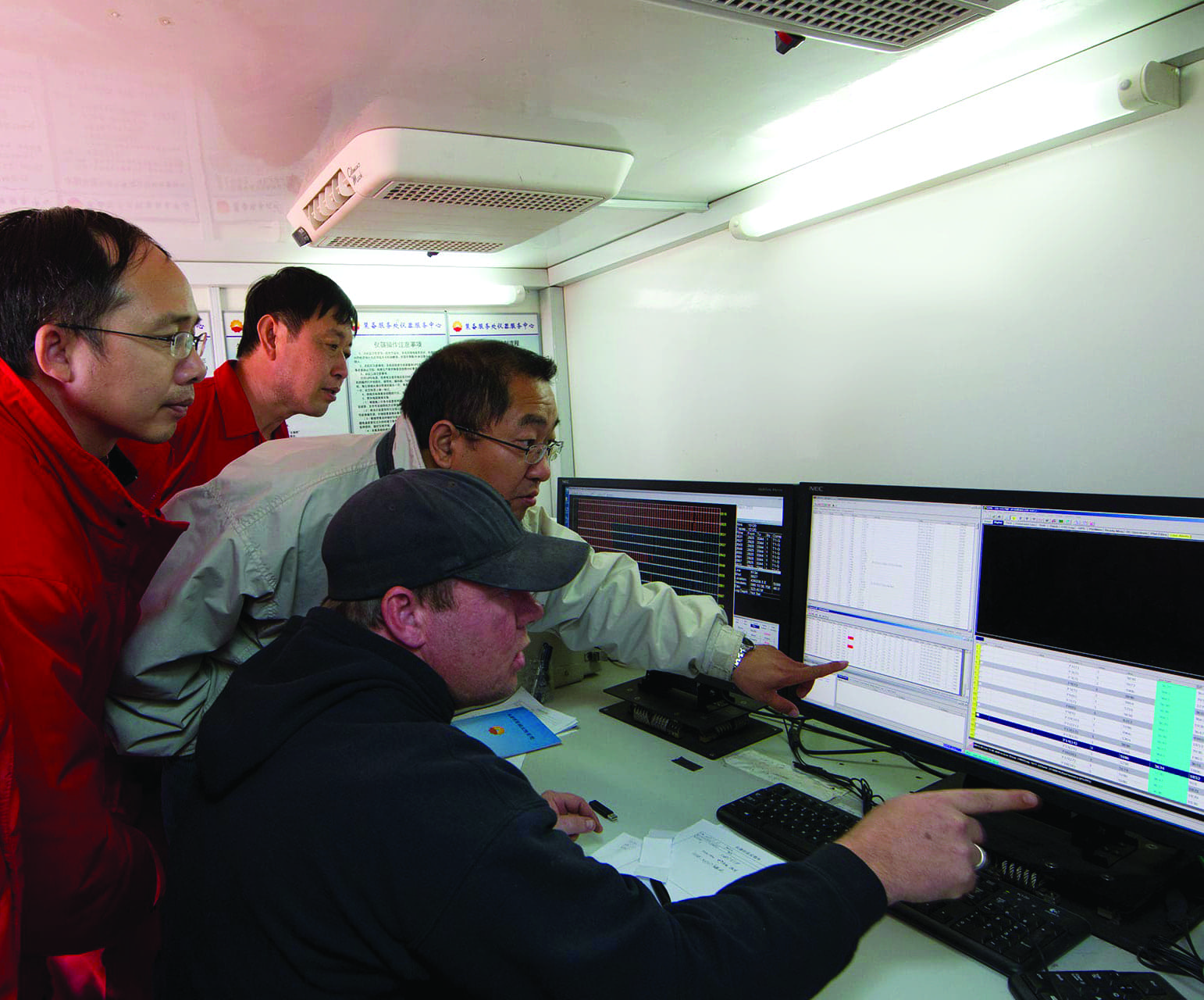 Представители нескольких международных компаний по разведке и добыче нефти были приглашены, чтобы лично убедиться в эффективности и надежности системы G3i при регистрации высококачественных данных. Приглашенным специалистам было интересно понаблюдать за тем, как BGP максимально увеличил уровни производительности в таком масштабном проекте, и они пришли в восторг, увидев в действии передовую технологию сейсмических исследований G3i. Внутри небольшого трейлера регистрирующей центральной станции геофизики BGP и другие операторы отслеживали в режиме реального времени данные во время работы с источниками, используя сложные программные инструменты G3i. Центральный модуль SPM разделял и коррелировал два активных патча из мега-расстановки во время работ DS4, одновременно обрабатывая несколько наложенных записей без задержек вычислений. Система регистрировала в среднем шесть терабайт данных в день, которые операторы выгружали на съемные модули жесткого диска для обработки. Как и ожидалось, система INOVA G3i функционировала в соответствии со своими спецификациями и не регистрировала никаких проблем при записи данных по всей расстановке.