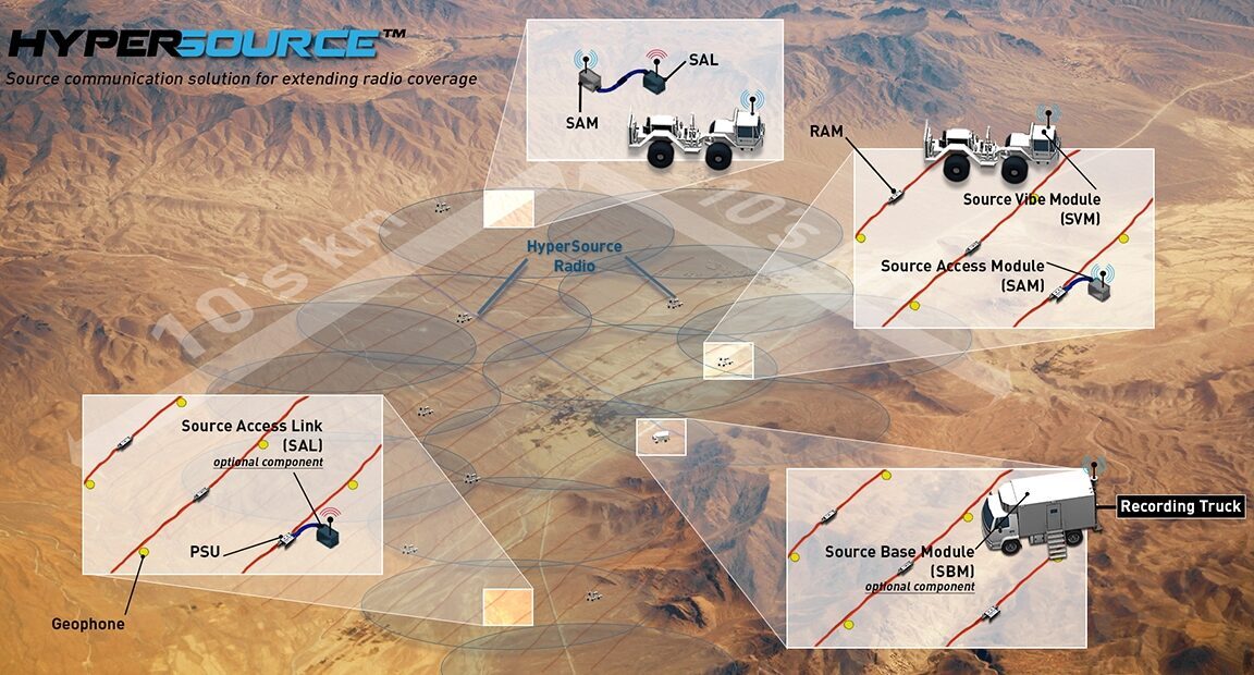 HyperSourceTM - это инновационный подход к преодолению существующих ограничений в области радиотехнологий и это новая функция, доступная в кабельной системе сбора и регистрации данных INOVA G3i HD с программным обеспечением iX1. HyperSource состоит из гибридной, кабельной и бескабельной сети связи, доступ к которой могут получить удаленные партии на проекте, работающие там, где это удобно с точки зрения логистики для эффективного производства. На примере высокопроизводительной вибросейсмики такая сеть может состоять из нескольких групп виброисточников, работающих в пределах или даже за периметром активной расстановки, на расстоянии до 10 километров от регистрирующей станции.